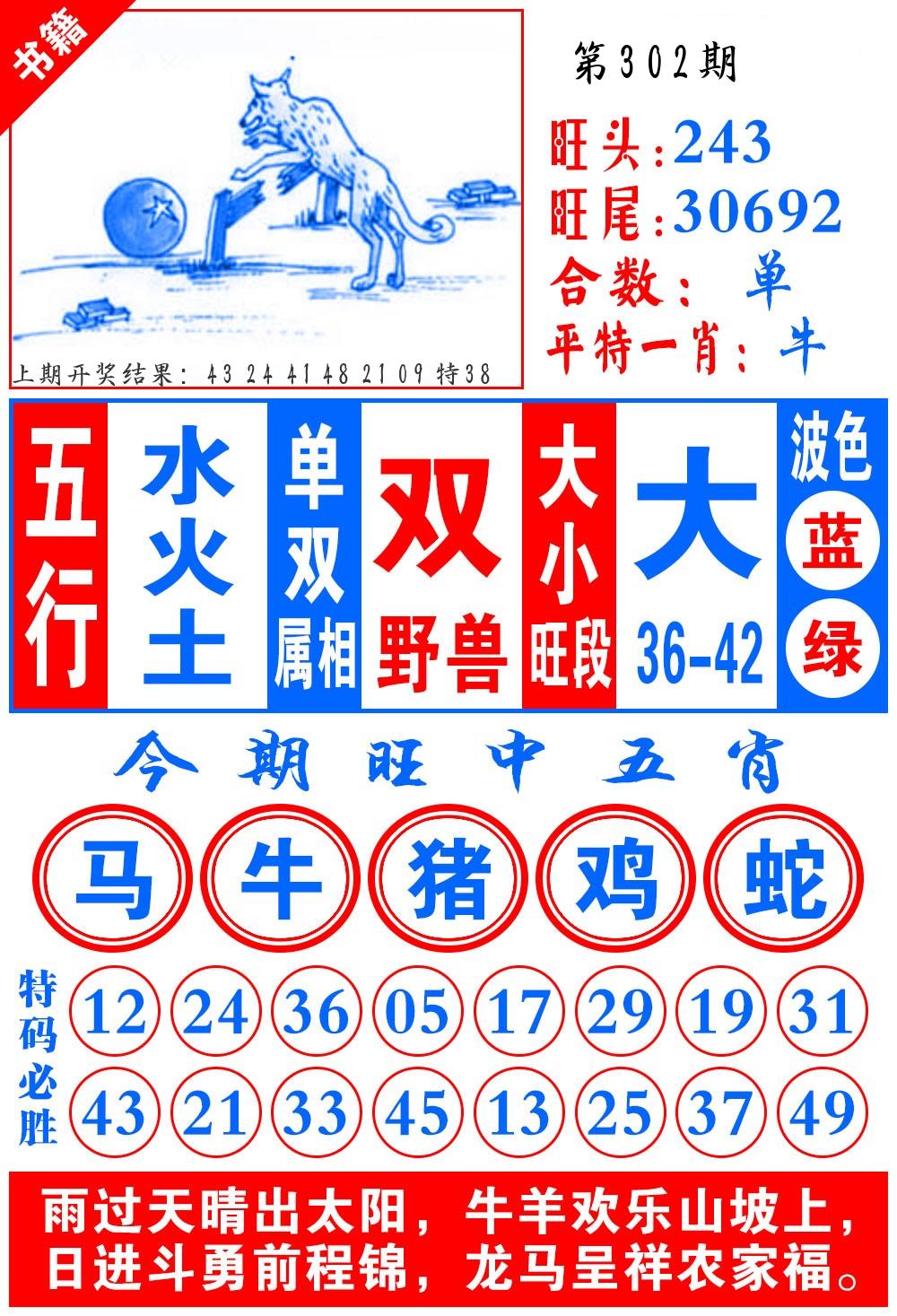 | 0301期推荐七肖: 狗牛蛇马猴虎兔 -平均压 |